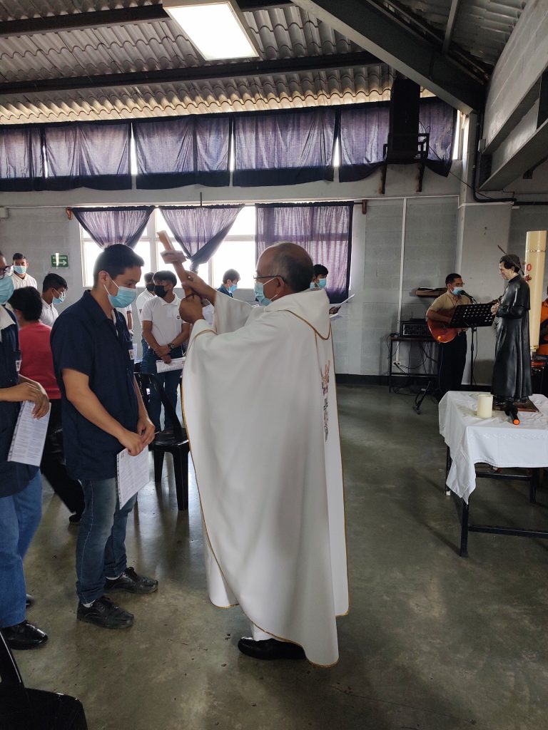 Luego se llevó a cabo la Santa Eucaristía, presidida por el Sacerdote Salesiano P. José Anael Pascual, quien recientemente se ha incorporado a la comunidad salesiana de la Parroquia La Divina Providencia. Al finalizar la Eucaristía, el P. Pascual impuso sobre las cabezas de los presentes, la reliquia de primer grado de Don Bosco, recibiendo así la bendición del Santo de la Alegría.